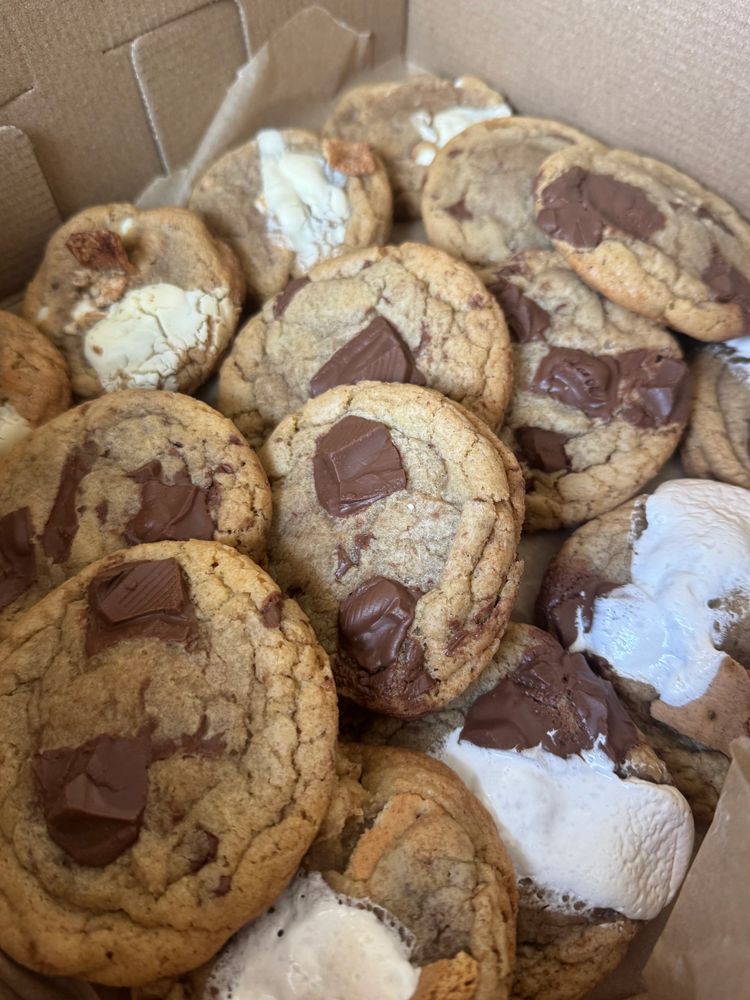 brown butter dough mixed with graham crackers and chocolate chunks topped with a large dollop of toasted marshmallow fluff